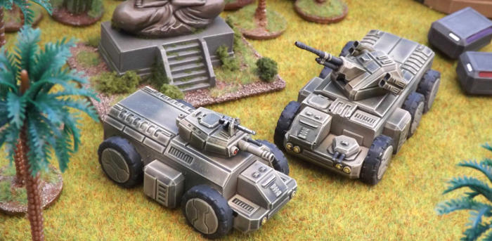 Armament concentrated on projectile firing weapons and ATGW missiles rather than powerguns, although some supplementary lasers are fitted to the turret of the Denel A20 Rhino Gun System. This is armed with a 9cm railgun, 3cm coaxial autocannon, twin Light Lasers and a heavy support weapon. The main advantage of the lasers is in offering some anti missile capability - other than the air defence Buffel and Wildebeest - no other vehicles used by the Sulwesi forces are similarly equipped (and none sport anti-buzzbomb systems).The Buffel four wheeled vehicles and Wilderbeest six wheeled falilies have many variants. The Denel R14AA Buffel Air Defence Variant carries Heavy RF Coilgun and Manta light Anti tank missiles but (unlike the APC variant) no infantry. Other vehicles include the R19AA Wilderbeest Air defence variant and the A13 Buffel Support. The Former is similarly equipped to the Buffel Air defence system carries Heavy RF Coilgun and Manta light Anti tank missiles it also has an extra forward turret but no infantry. The Buffel Support uses a 3cm auto cannon (as does the Wildebeest support).